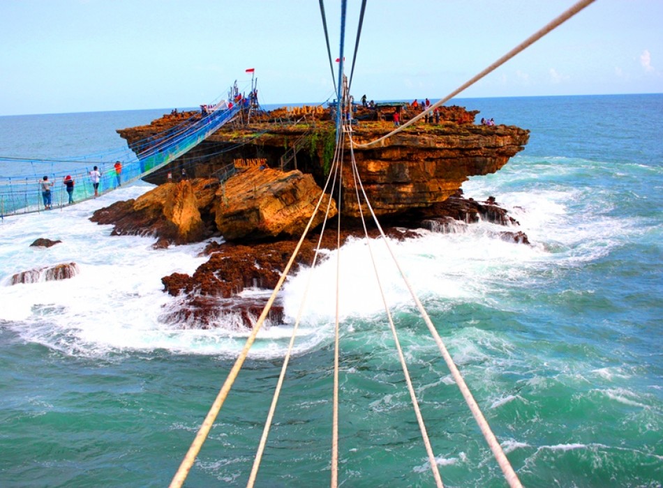 Unique experience on Timang beach. Made entirely from wood and ropes the gondola ride at Timang beach is entire hand operated with the help of a clever pulley system which connects the mainland to a smaller rocky island some 20 meters offshore called Watu Panjang which is also home to thousands of lobsters. The gondola was originally set up for this purpose, to ferry the local fisherman to access the lobster on Watu Panjang.