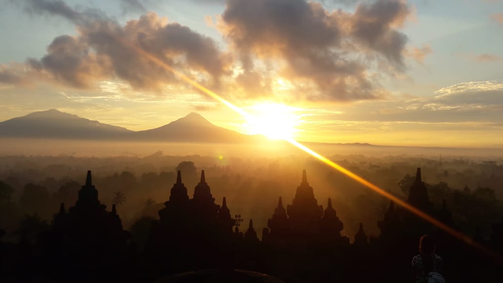 Sunrise on Punthuk Setumbu Hill are soft delicate pure light then visit the magnificent Borobudur Temple afterward as the UNESCO heritage.